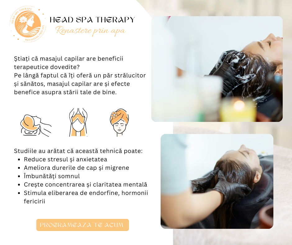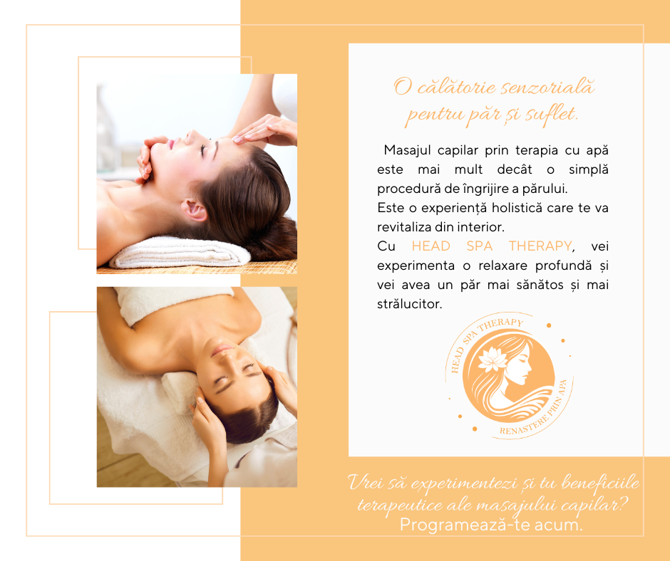 Head Spa Therapy este o terapie inspirată din tradițiile japoneze, dedicată relaxării profunde și regenerării scalpului. Combină masajul de relaxare, aromaterapia și tehnici de presopunctură pentru stimularea circulației sângelui, pentru a reda vitalitatea părului și echilibrul interior.